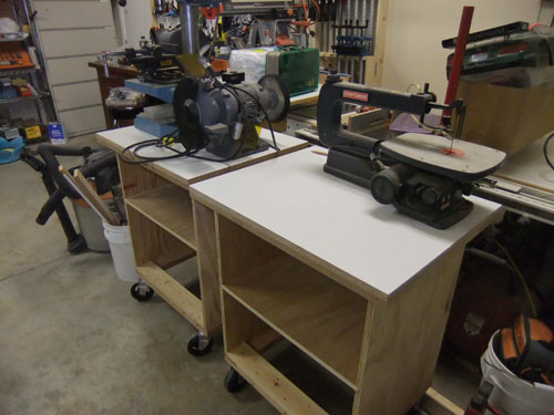 | So far this is what I have, two mobile table build mainly with plywood, MDF table top and 2x4 base. |