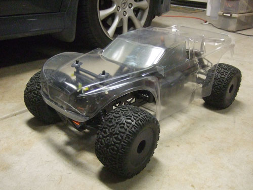 Preview of the TCS Flux 5T with an unpainted Proline Baja 5T Desert Rat body. In order to mount this body to the Savage I had to make some aluminum body mounts because the stock mount were weak and the rear mounts could not reach.