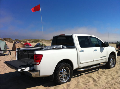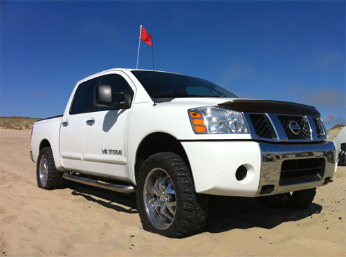 This past weekend we went camping at the Oceano Dunes, south of Pismo Beach. It was my first time on the sand with my Titan, and I was very happy with the outcome. When we first got on beach, drive along the coastline was pretty easy, even a 2wd sedan could make it without any problem. As we drove further, the sand got deeper and softer, that is when we started to have some trouble. We all made it, but we were spinning our wheels just to move at a crawl speed. And yes, no one has aired down there tires yet. Once we aired down to about 15 psi no one had any trouble at all. It is amazing how airing down your tires can make such a big difference. It was kind of funny to see all those people with RV's, trailers, 2wd trucks and even sedans trying to drive in the soft sand and getting stuck. And trust me there were a lot of people getting stuck. Sad to say I even had to pull out a fellow Titan owner who was buried up to their frame rails. Since there truck was 2wd they did not have any tow hooks in the front, so they tied the tow strap to their crossmember and they were lucky that it did not bend or break it when I pulled them out.